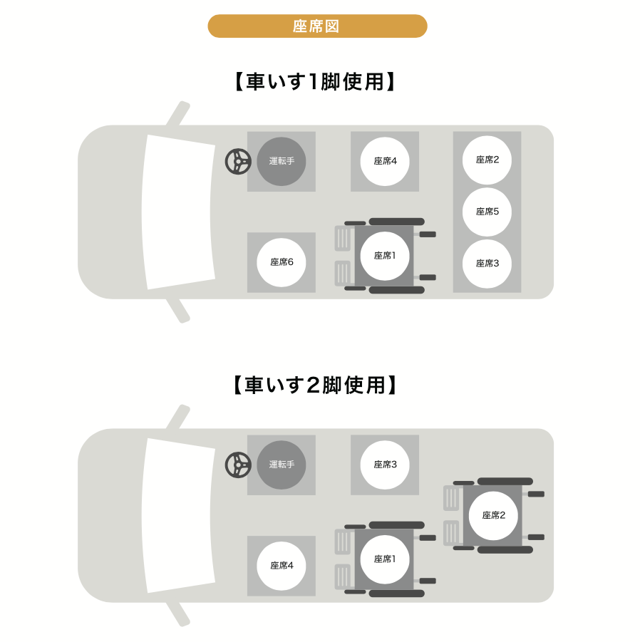 シートのアレンジにより車いす2名+2名 または 車いす1名+5名でご利用いただけます。